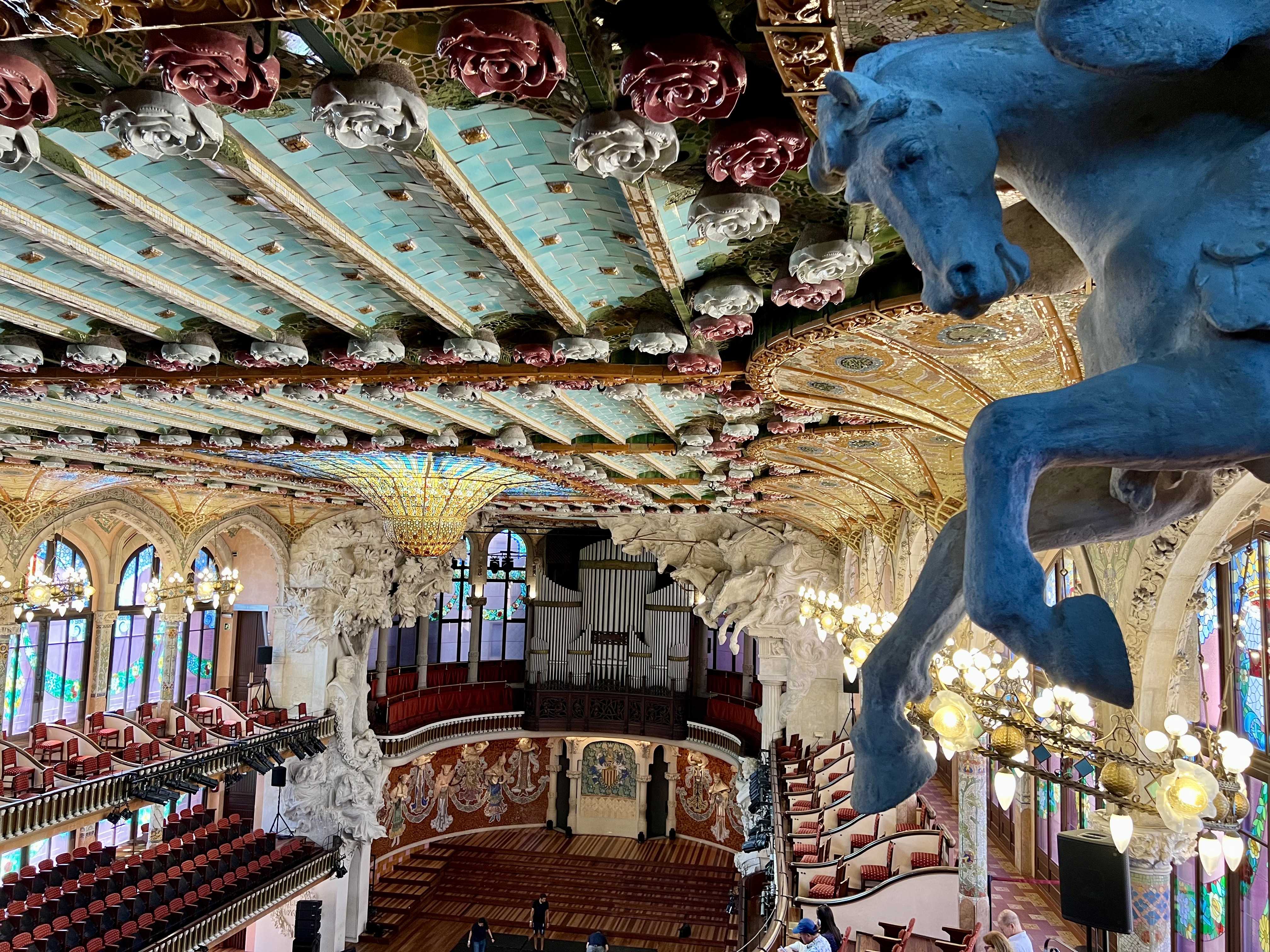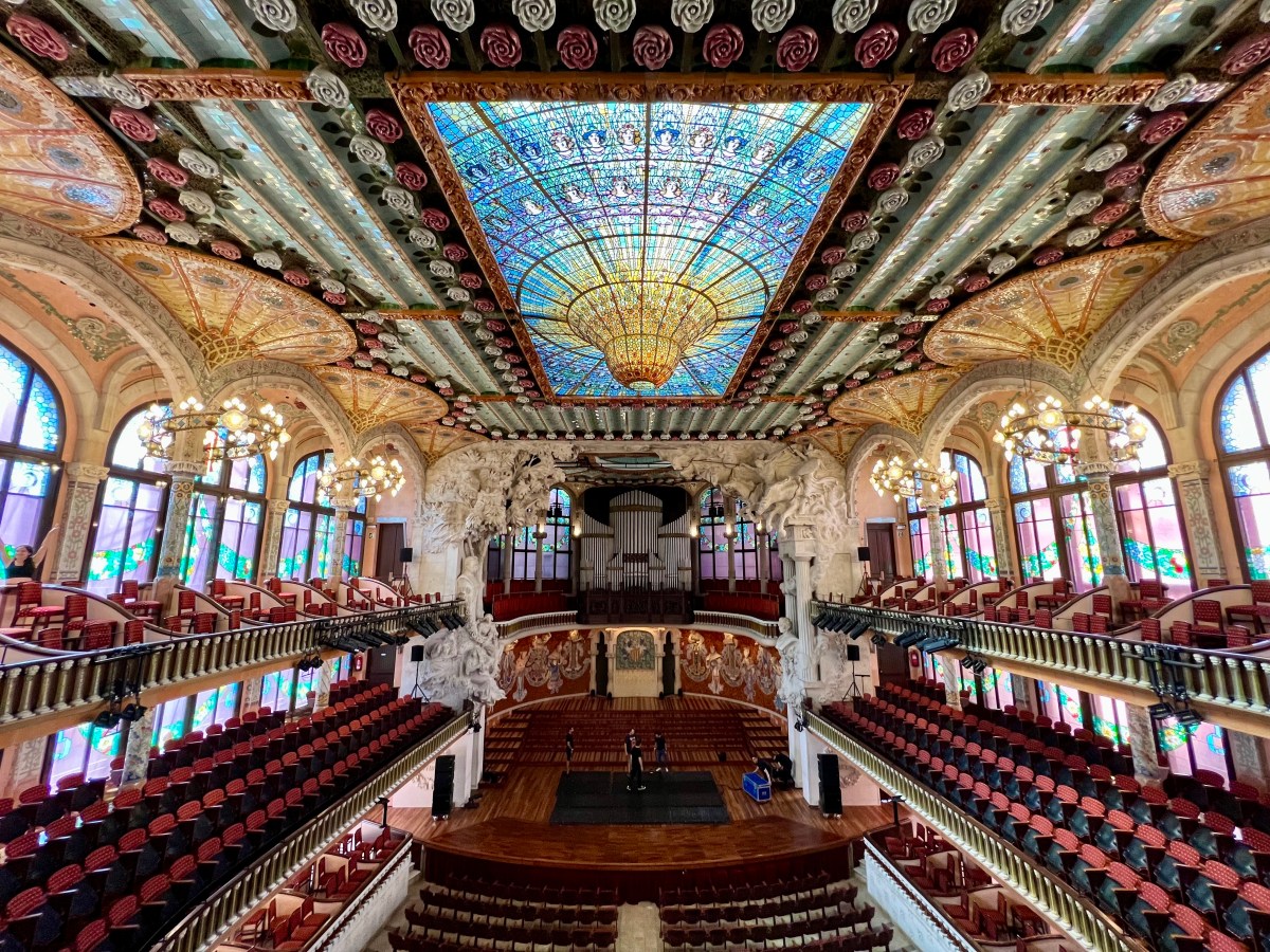 “The Palau de la Música Catalana was built between 1905 and 1908 by the modernist architect Lluís Domènech i Montaner as a home for the Orfeó Català, financed by popular subscription. The building is located in Sant Pere district, one of the most beautiful areas of Barcelona…The modernist building is designed around a central metal structure covered in glass, which exploits natural light to make the make Domènech i Montaner’s masterpiece into a magical music box which brings together all the decorative arts: sculpture, mosaic, stained glass and ironwork.” https://www.palaumusica.cat/en