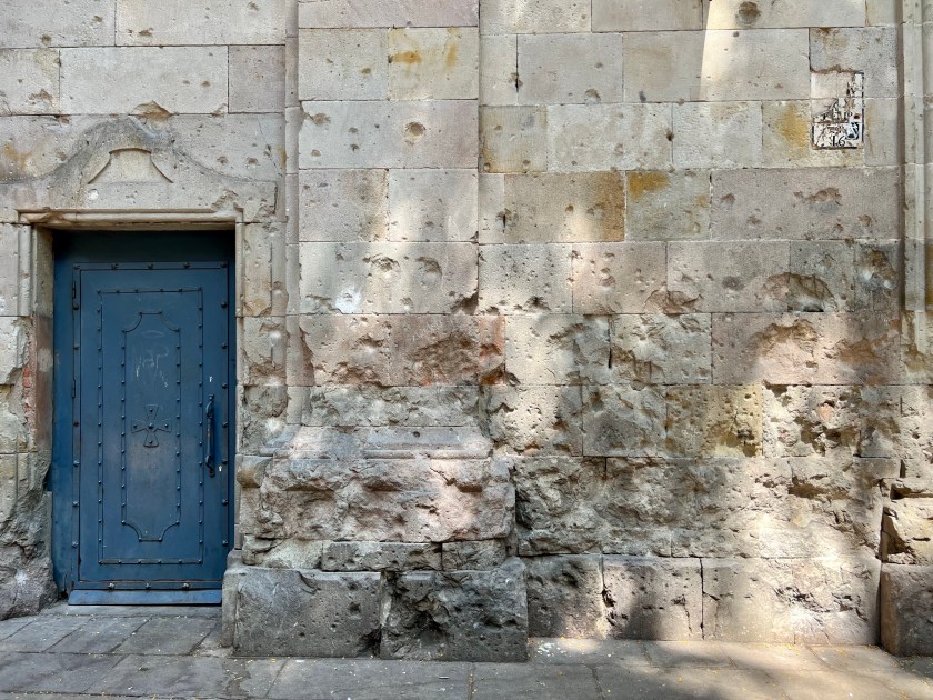 “Barcelona was continuously bombed on the morning of 30 January 1938, from 9 am to 11.20 am, by Franco’s ally, the fascist Italian air force. The Sant Felip Neri church, which was in the hands o Catalonia’s republican government, was being used as an air-raid shelter for children from the neighbourhood and other parts of the Spanish Republic, seeking refuge from the fascist terror. The bombs levelled the church, burying the children who had sought shelter in its basement. Some twenty died. The aerial bombings went on non stop, the bombs hampering efforts to evacuate the site. Forty two people were massacred that morning and over a hundred wounded. The square was devastated. The only thing left standing was the church façade, which still bears the marks of the shrapnel today. For years, Francoist propaganda offered an account of how the marks on the facade were caused by bullets from firing squads executing priests from the church, a version which covered up their part in the massacre.” City Council of Barcelona street sign