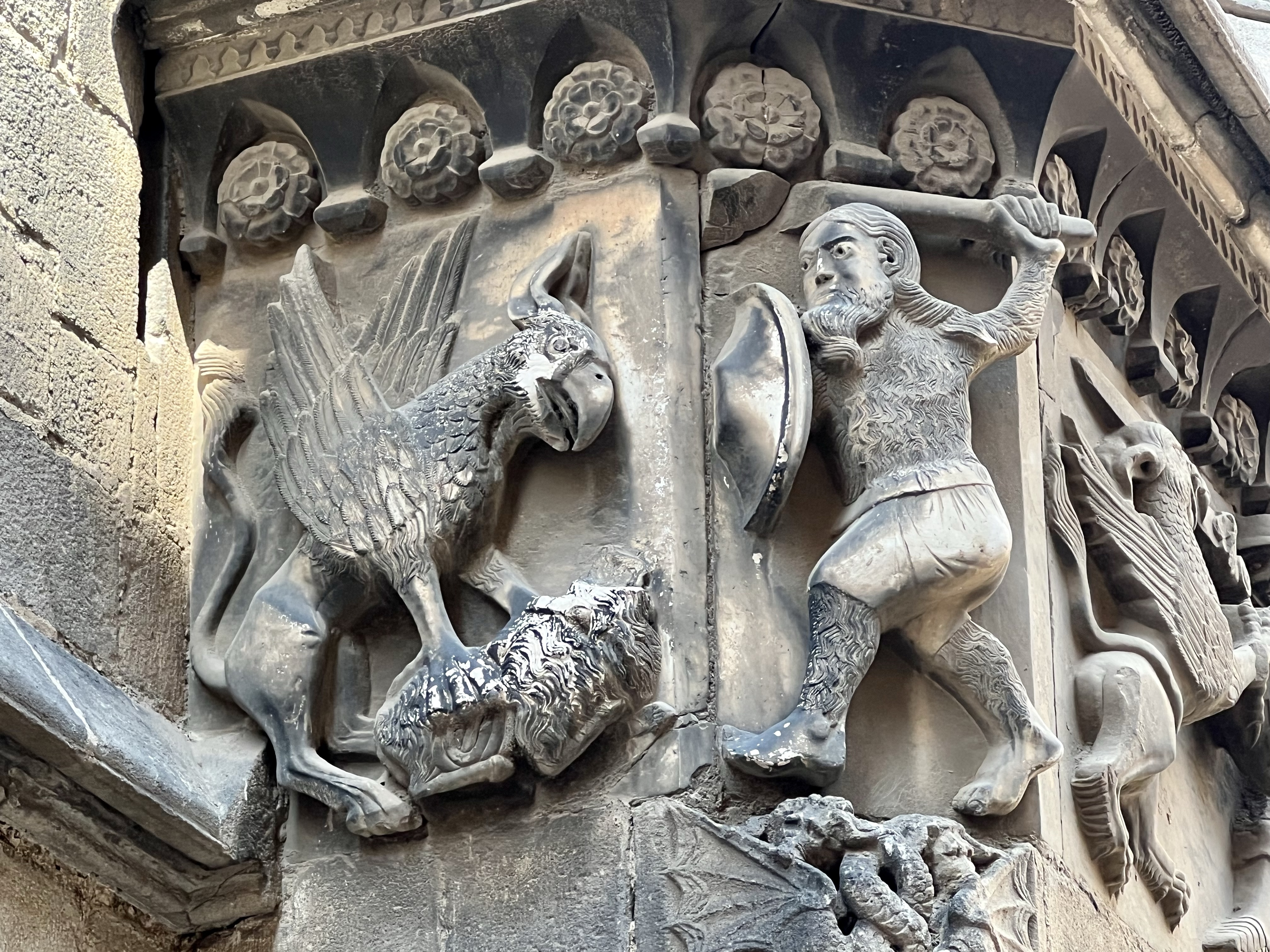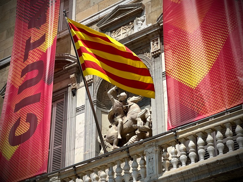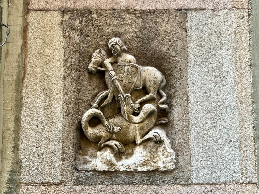 The patron Saint of Barcelona is San Jordi (Saint George). Images of Jordi slaying a dragon are seen throughout the city. San Jordi is recognizable due to the cross on his shield.