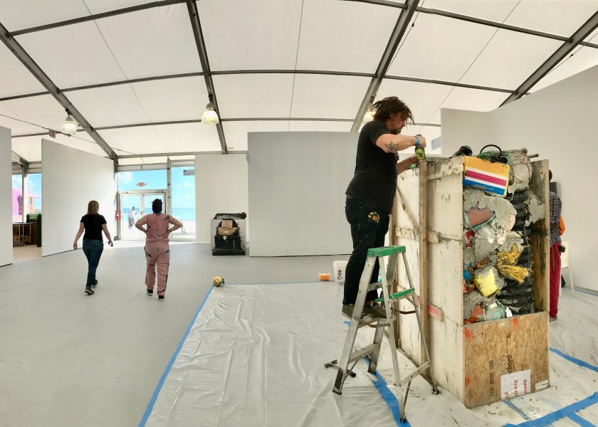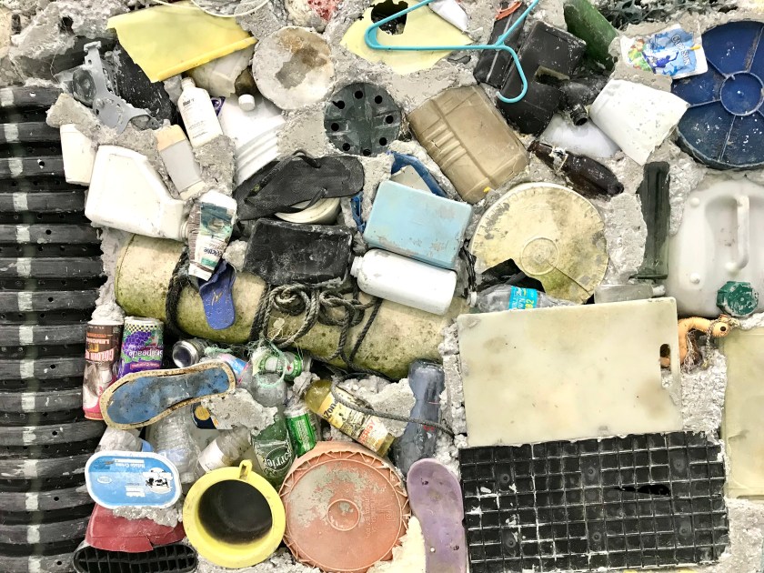 “Students from Florida International University made the Untitled version of Garbage Wall using trash collected in the water at the Deering Estate, located about 25 miles south of Miami Beach. A lot of the debris from Hurricane Irma drifted south, and you can see in the wall things like soda and beer bottles, flip-flops, a tennis ball, a clothes hanger, and a buoy. But the wall also tells stories specific to Miami. There is a water jug that likely fell from one of the rafts used by Cuban migrants traveling illegally to the United States. And there is an illegal lobster trap—the students plan to return to the Deering Estate, to remove the traps they found there.” Sarah Douglas in ARTnews