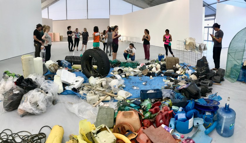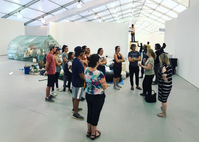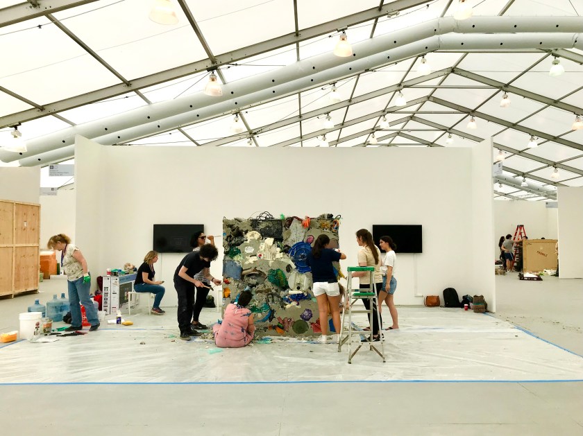 The FIU students collected marine debris from the island of Chicken Key of the Deering Estate over several months. They brought this debris to the UNTITLED fair and worked under the guidance of Jane Crawford and Jessamyn Fiore to construct Garbage Wall.