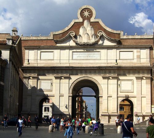 “The original name was Porta Flaminia because from here the consular road Flaminia came out, and still does, which in ancient times began much further south, from Porta Fontinalis, near the Altare della Patria. In the 10th century it was named St. Valentine from the basilica and catacombs of the same name, located at the beginning of the current Pilsudski avenue. […] Given the importance covered by the Via Flaminia, from the earliest times of its existence it had the main role of sorting city traffic rather than a defensive use. This led to the supposition, however doubtful, that it was initially built with two archways (with the two lateral cylindrical towers) and that only in the Middle Ages, when the traffic requirements ceased also due to the demographic collapse, it had been brought back to a single arch . […] The current appearance is therefore the result of a sixteenth-century reconstruction, also made necessary by the renewed importance that, at that time, the gate had again assumed, from the point of view of urban traffic coming from the north. The external façade was commissioned by Pope Pius IV to Michelangelo, who however transferred the task to Nanni di Baccio Bigio, who carried out the work between 1562 and 1565 inspired by the Arch of Titus. The four columns of the façade come from the ancient basilica of San Pietro and framed the single large archway, surmounted by the commemorative plaque of the restoration and the papal coat of arms supported by two cornucopias; the original towers with a circular base were replaced by two mighty square watchtowers and the whole building was surmounted by elegant battlements. […] The internal façade was instead built by Gian Lorenzo Bernini for Pope Alexander VII and was carried out on the occasion of the arrival in Rome, on 23 December 1655, of the abdicated queen Christina of Sweden.”