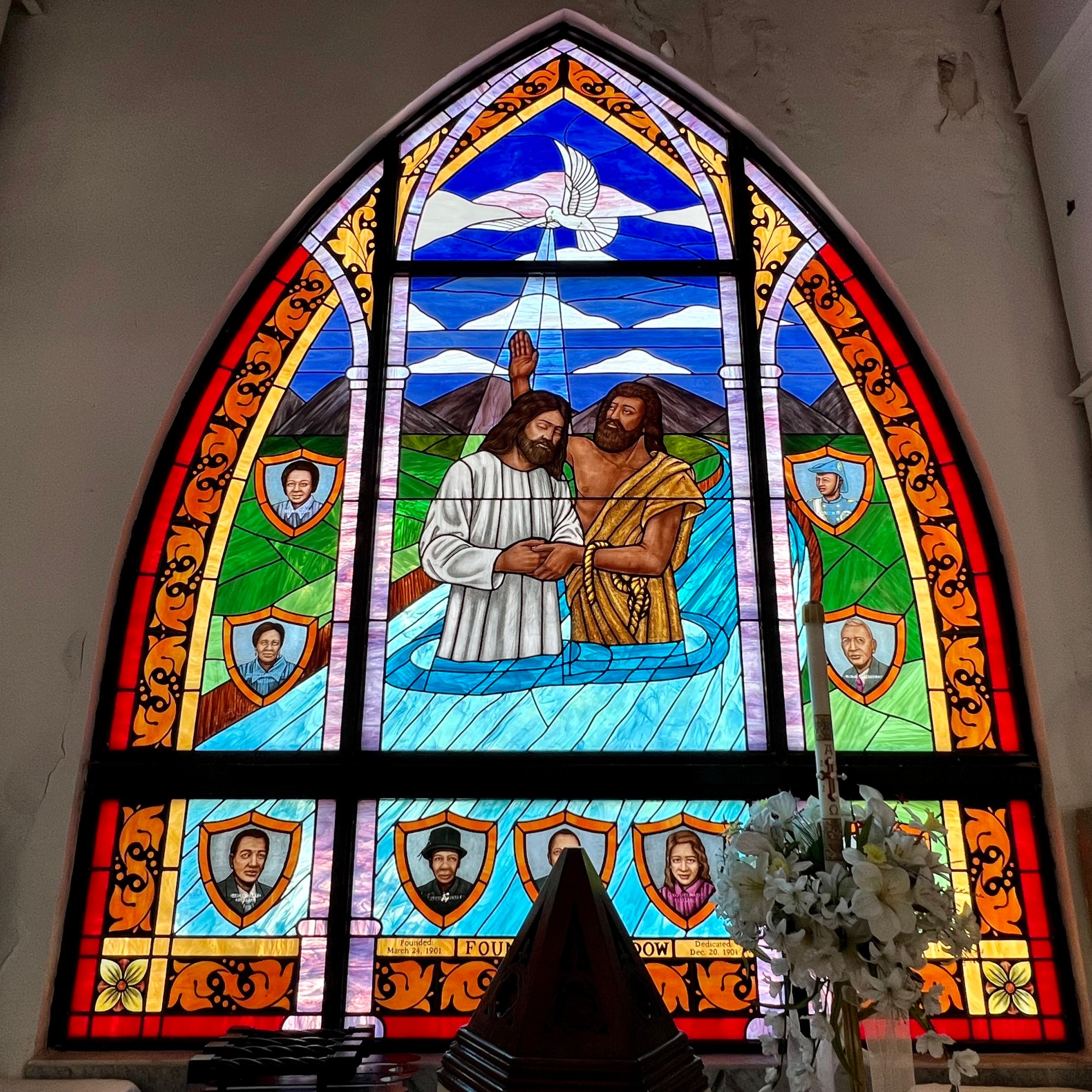 The ancient front door (about 375 years old) came from a Monastery in the Pyrenees Mountains. It is made of hand-carved walnut backed wit oak and has the original hand-wrought iron fittings. There was a hole in the lower right side of the door for the cats to take care of the church mice! In the niche above the door is the statue of “The Welcoming Christ” by sculptor Hubert Dumont.