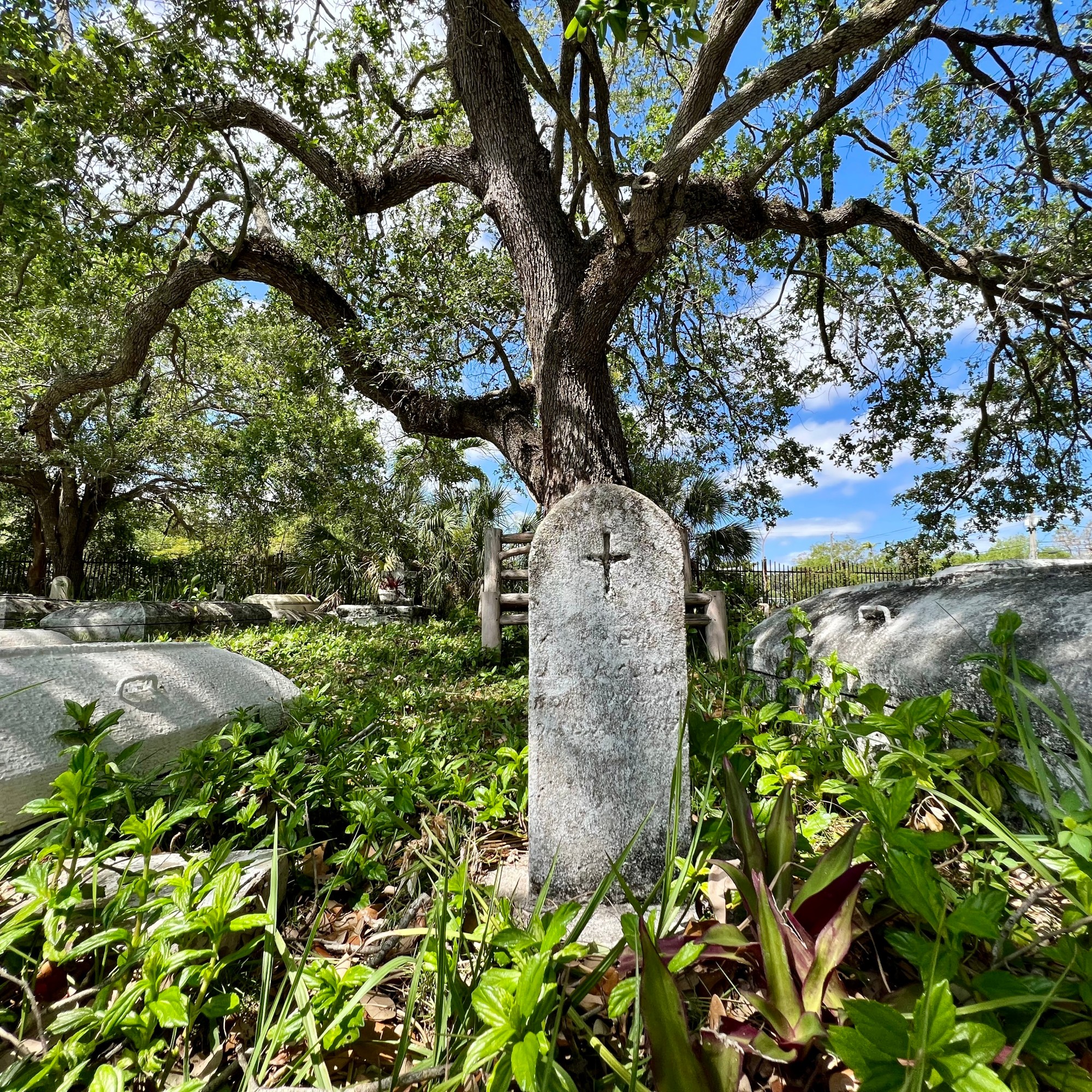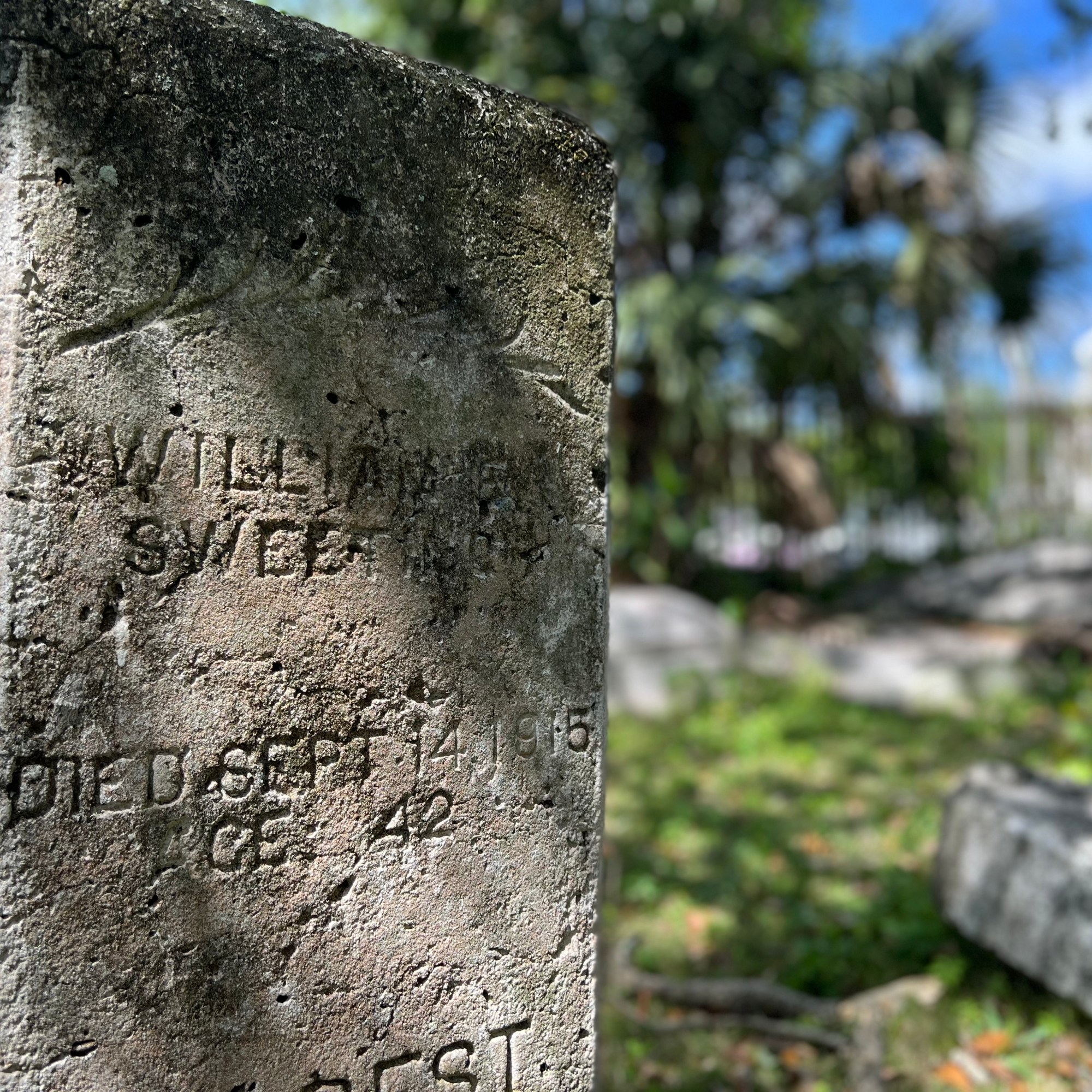 “The Historic Coconut Grove Cemetery was first used as a graveyard for the Grove’s Bahamian settlers in 1906. The community’s original cemetery was a small lot opened by the city in 1904 on what is now the 3500 block of Charles Avenue. That site was judged by the town leaders to be too small to accommodate the needs of the growing population and the cemetery was moved to its present location. Because of the upset caused by moving the cemetery, the “Coconut Grove Colored Cemetery Association” was formed to take over the responsibility for the yard. In 1913, five families purchased the property for $140.00 as trustees for the Association. These families were the Burrows, Higgs, Reddick, Ross and E.W.F. Stirrup families, all of whom were local civic leaders. Many of Coconut Groves’ Bahamian pioneers are buried in this cemetery. Joseph Mayor who owned the bicycle shop is buried here, as are Daniel Anderson, a Bahamian seaman and his wife Catherine who was one of the founders of Christ Episcopal Church. Captain John Sweeting, a successful developer and commercial fisherman, and his family are also here. Many more of the original settlers of the Grove The Historic Coconut Grove Cemetery Marker with cemetery in background may also rest in this cemetery in the numerous unmarked graves. Some of the markers in this cemetery are unique to South Florida. The twelve anthropomorphic or “head and shoulders” stones are found nowhere else in Dade County. They reflect Bahamian background and rich African American culture of the neighborhood. Today the cemetery is still cared for by the Coconut Grove Cemetery Association and is recognized as an historic site.” City of Miami Historical Marker