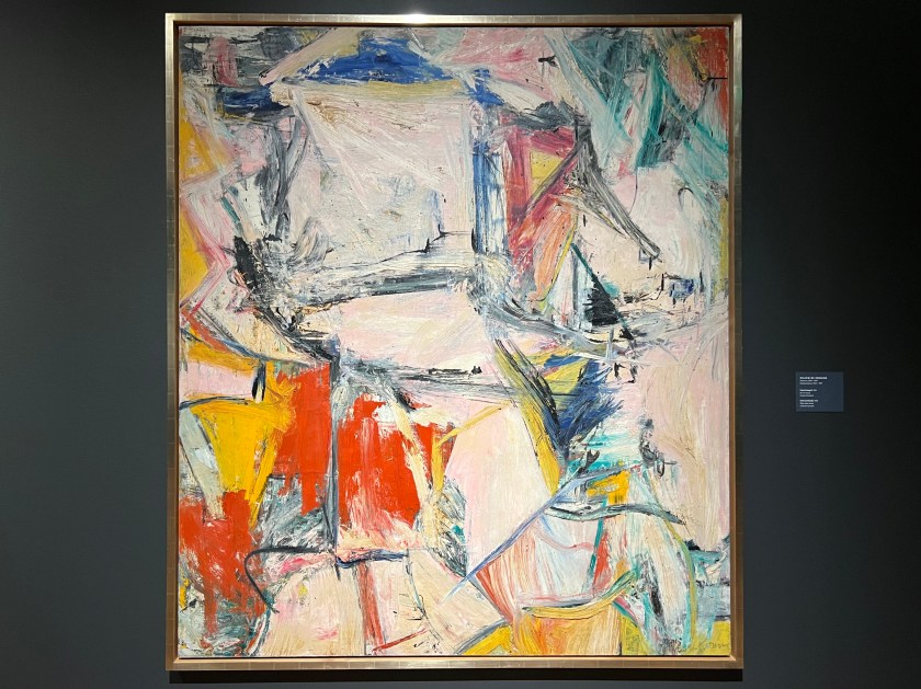 “Most Abstract Expressionist paintings are large scale, include non-objective imagery, lack a clear focal point, and show visible signs of the artist’s working process, but these characteristics are not consistent in every example. In the case of Willem de Kooning…the visible brush strokes and thickly applied pigment are typical of the “Action Painting” style of Abstract Expressionism also associated with Jackson Pollock and Franz Kline…we can easily imagine de Kooning at work, using strong slashing gestures, adding gobs of paint to create heavily built-up surfaces that could be physically worked and reworked with his brush and palette knife.”…Born in the Netherlands, de Kooning was trained in the European academic tradition unlike his American colleagues. Although he produced many non-objective works throughout his career, his early background might be one factor in his frequent return to the figure.” Dr. Virginia B. Spivey smartarthistory