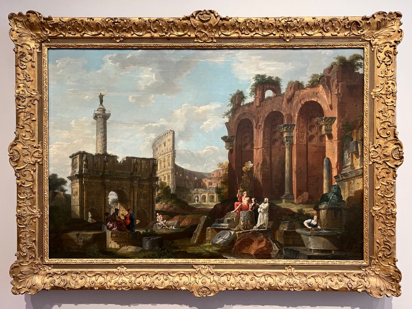 “The architectural capriccio (fantasy) differed from the veduta (view painting) in that it abandoned the authority of the map and juxtaposed a variety of famous buildings in imaginary arrangements for the sole purpose of delighting the viewer. The painter and architect Panini was adept at both types. This capriccio brings together an ambitious assemblage of the Colosseum, Trajan’s Column, the Arch of Constantine, and the Baths of Caracalla — all monuments one might see in an hour’s walk through downtown ancient Rome. Panini also served as a professor of optics at the French Academy, Rome. The renowned French architectural painter Hubert Robert was one of his studio assistants.” Norton Museum of Art