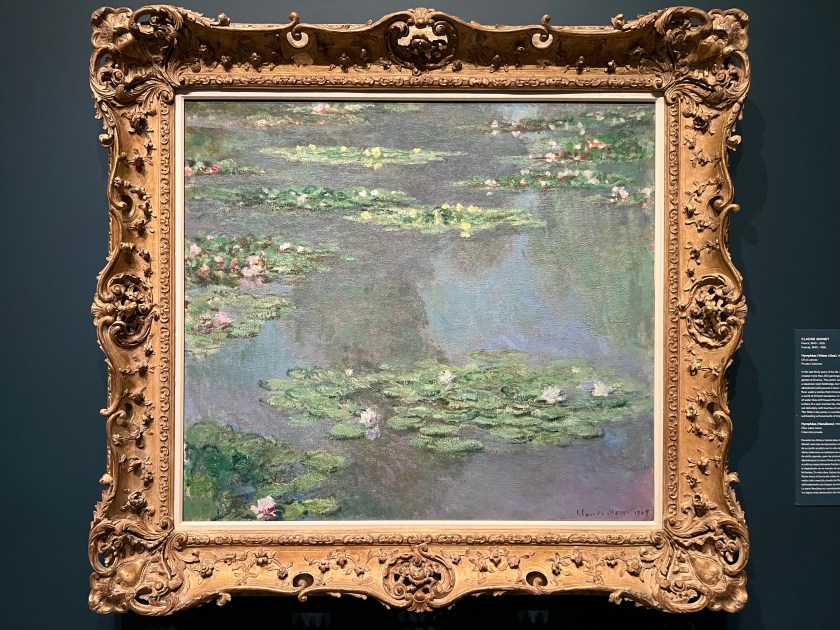 “Born into a family of painters, Charles-François Daubigny moved in 1843 to Barbizon in order to paint out of doors with like-minded artists like Jean- Francois Millet, Théodore Rousseau, and Jean-Baptiste-Camille Corot. He has the distinction of being the first important artist to convert a houseboat into a floating studio (also done later by Monet), to help him capture the watery subjects he preferred. This work is an excellent example of the late first phase of Daubigny’s work, which is distinguished by glassy surfaces and a preoccupation with light and reflection. It also shows a hint of the rougher textures and thicker paint he would adopt from Courbet, who he met two years earlier.” Norton Museum of Art