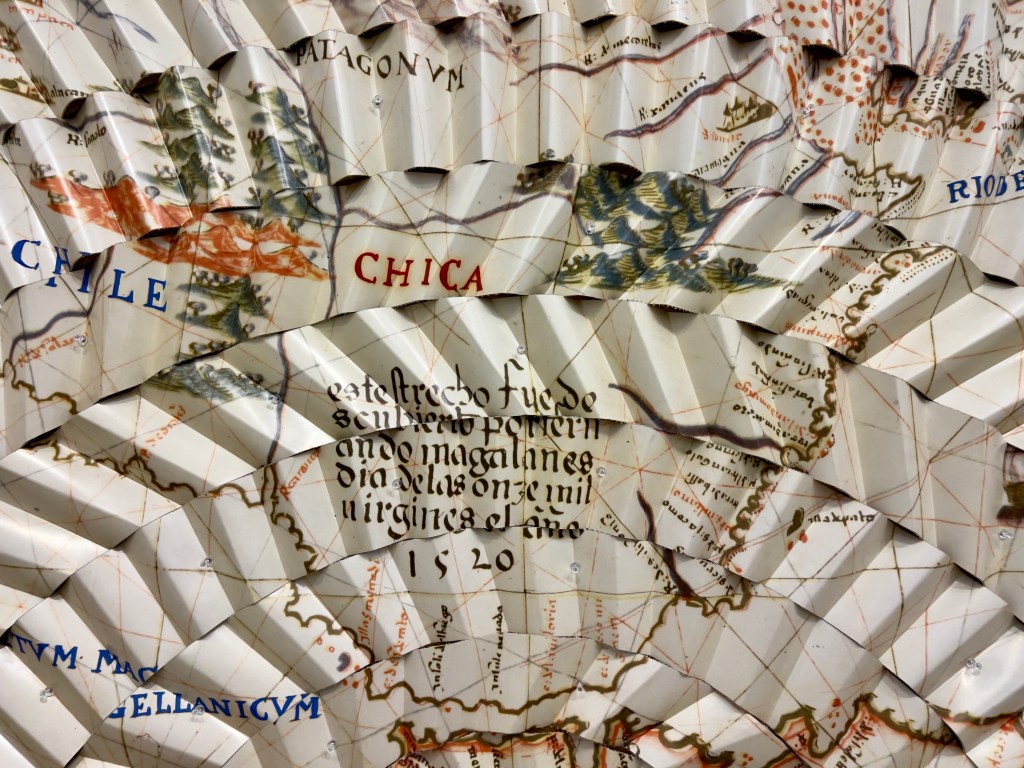 “The mixed media and moving image artist Miguel Angel Ríos explores Latin America and its colonial past through a dynamic and conceptual investigation using the history of European map making as its base. Plumed Crest is part of the artist’s examination of the 500th anniversary of Christopher Columbus arriving in the Caribbean Islands. The way that the artist cuts, contorts, and re-creates the maps is offered as criticism of the “discovery of the Americas” that has been a cornerstone of American history. The title and shape of this piece is a direct reference to El Penacho de Moctezuma, or Moctezuma’s headdress, a featherwork crown that tradition holds belonged to Moctezuma Il, the Aztec emperor at the time of the Spanish conquest.”