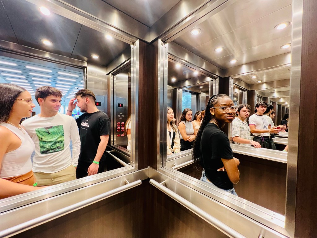 “Since the late 1990s, Erlich (b. 1973, Buenos Aires, lives in Buenos Aires) has created a highly distinctive body of sculptures and site-specific installations in which the architectural appearance of the everyday functions as a perceptual trap, leading an unsuspecting viewer into a visual paradox that systematically defies certain laws and attributes of the material world. In Erlich’s parallel universe, stairs lead nowhere, elevators don’t stop at any destination, passive spectators become active participants, clouds take on physical characteristics, and the solidity of constructed spaces turns out to be a fleeting optical illusion. Liminal has been conceived as a sequence of spaces that one might encounter in the course of an ordinary day: elevator, subway, classroom, hair salon, sidewalk, swimming pool, laundry room—even a window through which the neighbors’ windows can be seen. Each space is fabricated to serve as a precise simulation of the place it references, so that the encounter with Erlich’s illusion tends to occur as a surprise on the viewer’s part that such an ordinary spot should conceal such extraordinary qualities.The exhibition’s title refers to a transitional zone located at the threshold of another space, and indirectly suggests being on the verge of crossing over, or entering into, a new destination or state of existence—a sensation reinforced in Erlich’s work. To hover at the liminal edge of an experience suggests being caught between a prior reality that has been left behind, and a new reality beckoning at close range, but always slightly beyond our grasp. Erlich’s work suggests that despite our collective pride at being able to instinctually locate ourselves within the physical world, the truth is that most of us are engaged in an extended game of probability and chance, in which situations that can only be real within our dreams cast a spell of enchantment over our waking lives. The accumulated impact of experiencing multiple Erlich works within a single exhibition tends to leave viewers with an intensified awareness of this inherent duality about daily life.” https://www.pamm.org/en/exhibition/leandro-erlich-liminal/