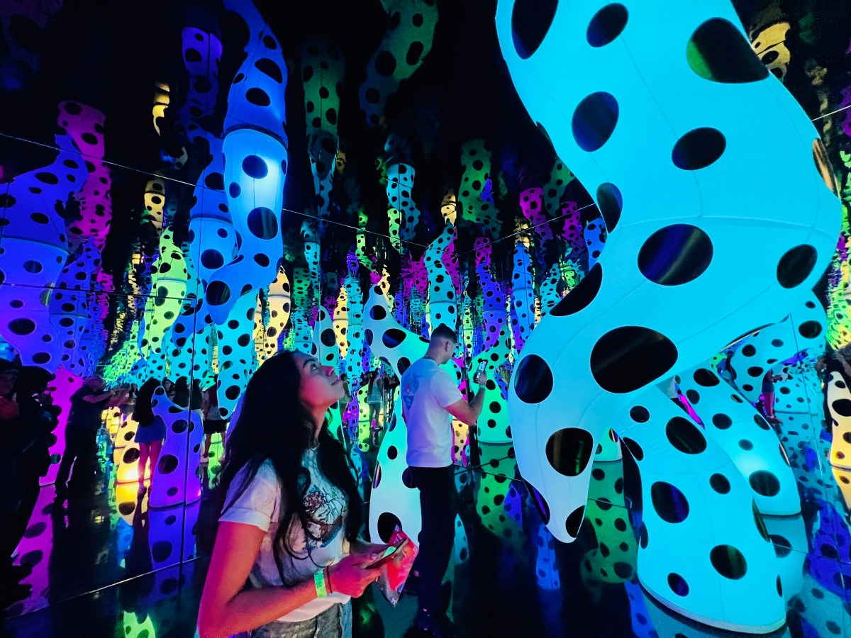 “LOVE IS CALLING is the largest and the most immersive and kaleidoscopic of the artist’s Infinity Mirror Rooms. Representing the culmination of her artistic achievements, it exemplifies the breadth of her visual vocabulary—from the signature polka dots and soft sculptures to brilliant colors, the spoken word, and, most importantly, endless reflections and the illusion of space. The darkened, mirrored room is illuminated by inflatable, tentacle-like forms—covered in the artist’s characteristic polka dots—that extend from the floor and ceiling, gradually changing colors. As visitors walk through the installation, a sound recording of Kusama reciting a love poem in Japanese plays continuously. Written by the artist, the poem’s title translates to Residing in a Castle of Shed Tears. Exploring enduring themes including life and death, the poem poignantly expresses Kusama’s hope to spread a universal message of love through her art.” https://www.pamm.org/en/exhibition/yayoi-kusama-love-is-calling/
