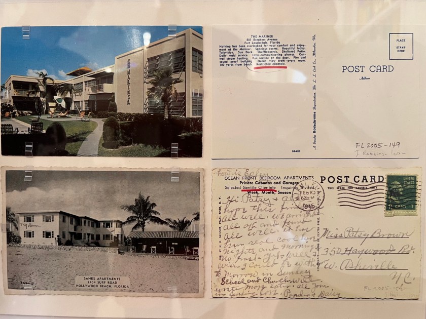 “When Jews began settling in the area in the 19th century, landlords and business owners routinely posted “Gentiles Only” signs on their properties. Such discrimination persisted into the 1950s. “Always a view, never a Jew,” read one hotel advertisement from the 1930s. Another, from the Coronado Hotel, read: “Air-conditioned rooms available. Oceanfront luxury at low cost. Gentile clientele.” Others made do with the somewhat more subtle “Restricted Clientele.” The first synagogue in Miami Beach, Beth Jacob, was built in 1929 on Washington Avenue between 3rd and 4th streets because at the time Jews were not allowed to live north of 5th. The building, which operated as a synagogue until 1986, has since been turned into the Jewish Museum of Florida.” Uriel Heilman, Jewish Telegraphic Agency
